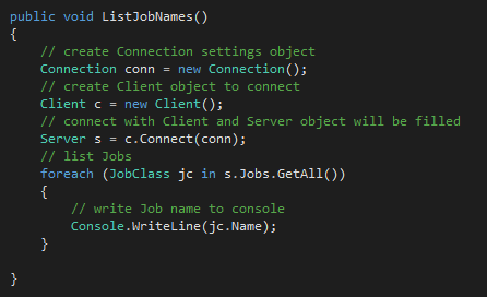 To connect to the VisualCron Server you need to create a Client object first. The Connect method returns a Server object. The Server object has access to all main objects within VisualCron.
