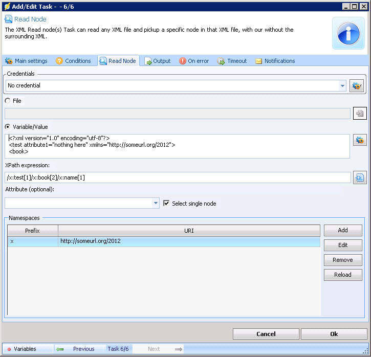 Now with the namespace in the XML file, add the namespace in the Namespaces list and add a prefix, e.g. x.
