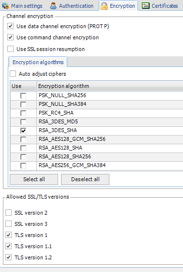 Encryption: Deselect "Auto adjust ciphers" and only choose "RSA_3DES_SHA".