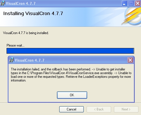 The installation and the rollback has been perform ->unable to get installer types in the C:\Program Files\VisualCron 4\VisualCronService.exe assembly.-> unable to load one or more of the requested types.Retrieved the LoaderExceptions property or more information.