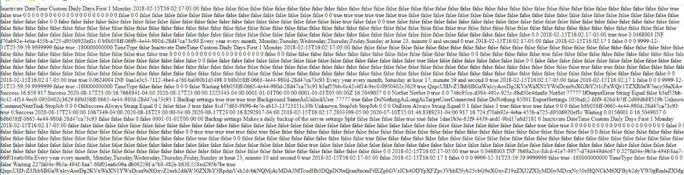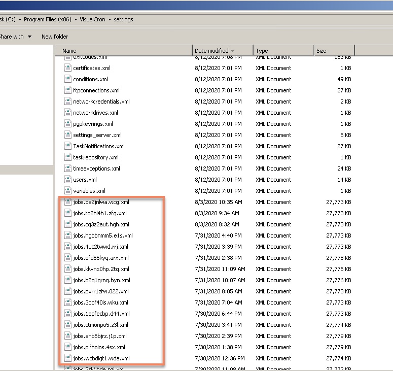 The time stamp on the file (data and time), specifically the hour/minute are not "similar" from day to day. I am running the "backup settings" job which does export the settings. This is the job that is created by default when VisualCron is installed. This job runs at defined times (11:59am and 11:00pm). The jobs.xxxx.xxxx.xml files seem to be created at "random" times during the day. I'm running VisualCron version 9.0.0 Pro. I only discovered this behaviour a couple a days ago. The ...\settings directory has jobs.xxxx.xxxx.xml dating back to over 2 years. Can't recall what version was installed 2 years ago. I routinely do an upgrade of the VisualCron version ("in place upgrade" and not an uninstall and then an install). I'm always a couple of versions behind the most recent version.