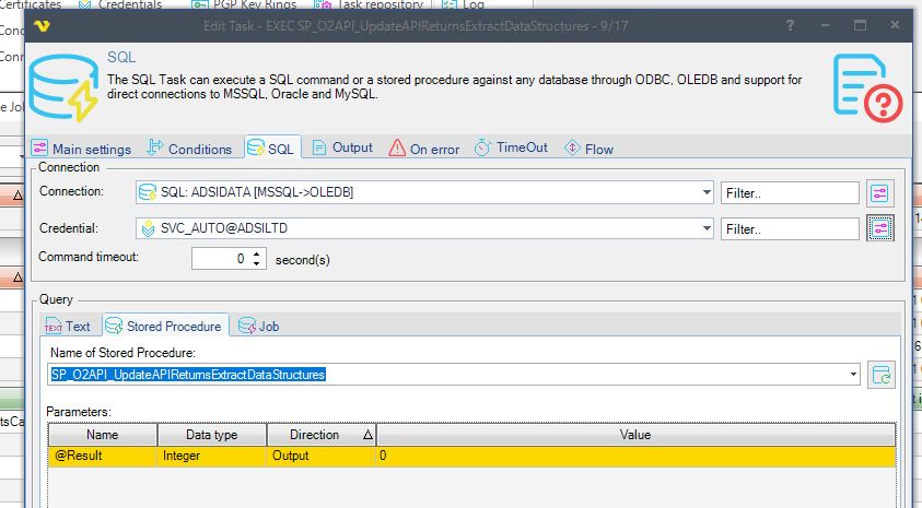 The task just executes a SQL Stored procedure with an output parameter of an int type.