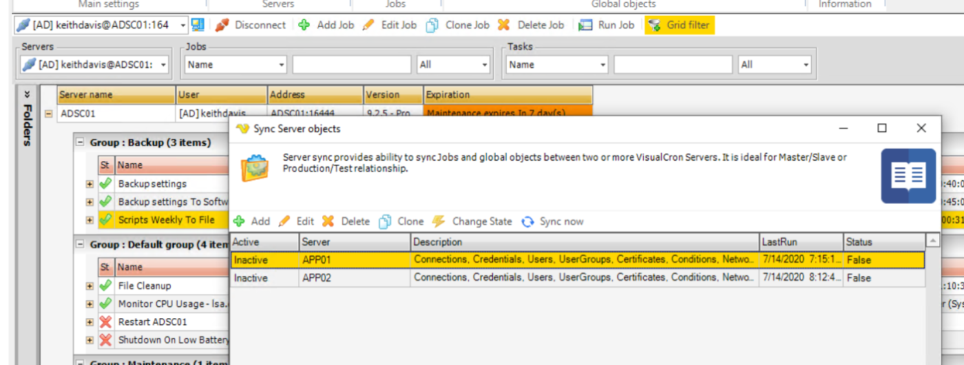 Hi Keith. So what you do is you sync from remote server(s). It is mainly used for master/slave functionality or test the relationship between production/test server(s). If you bring up the documentation in VisualCron (F1) and search for "Sync server" there should be documentation of it - hopefully it will clear things up a little bit, if not, let me know what you want to be clarified