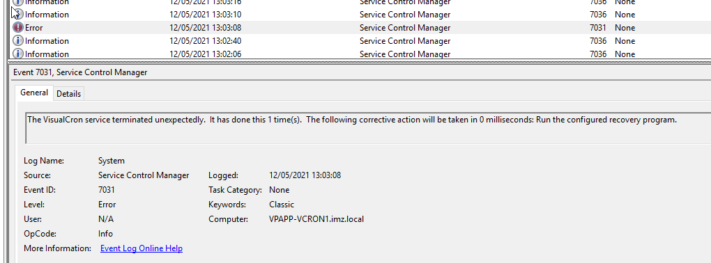 About once or twice a week the VisualCron service just stops.