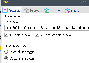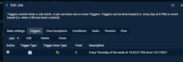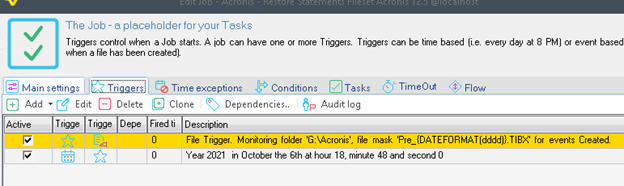 I have a job with a Custom Trigger. It has two triggers that are dependent on each other. One is a time trigger for 6:48 pm and the other is a file trigger