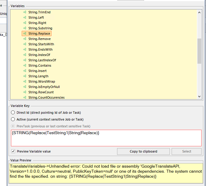 We have also the same issue, non of the built-in string manipulation functions work anymore -> could not load assembly GoogleTranslateAPI... will try to go back to 9.8.5 because some critical jobs do not run anymore!