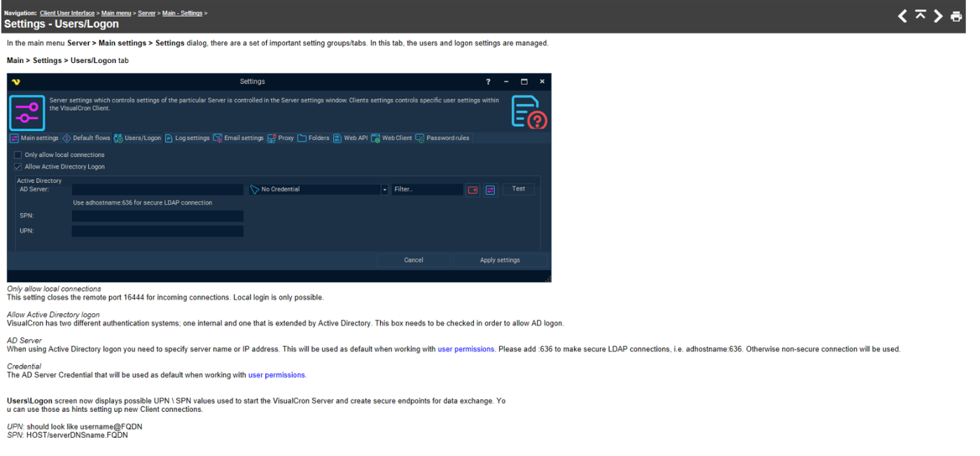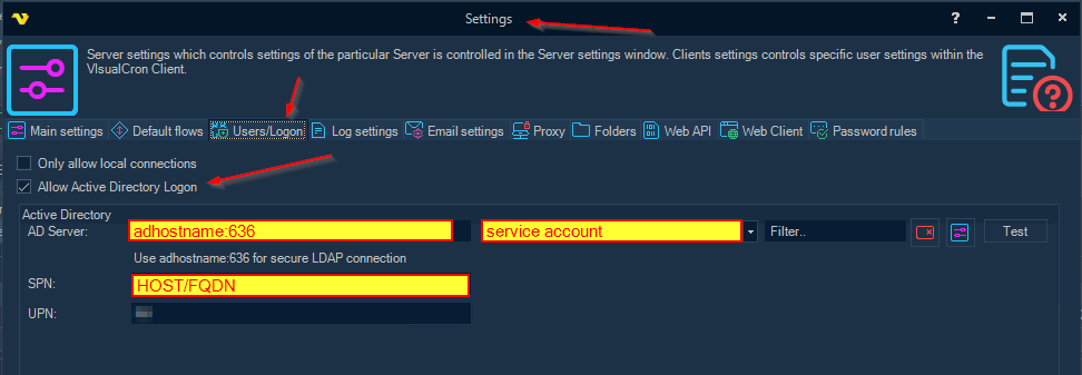 - visualcron 9.9.8 server side --> pretty much defaults, but if you are using AD, make sure to check "Allow Active Directory Logon" under the "Users/Logon" settings