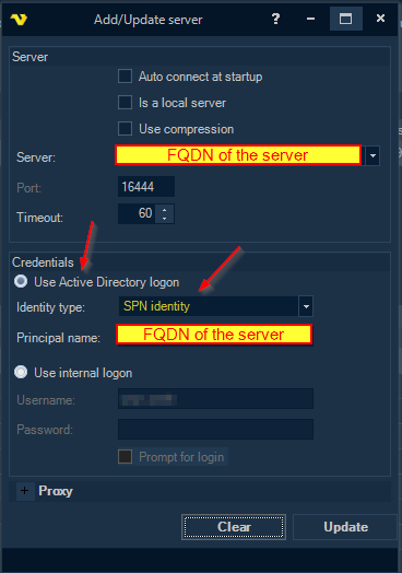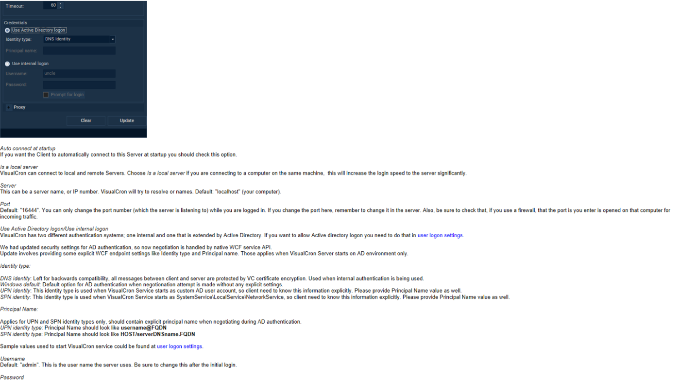- visualcron 9.9.8 client side --> pretty much defaults, but when you add in a server connection with AD logon --> select "SPN identity" and under "Principal name" --> enter the FQDN of the server. In the end --> my settings looked like this on the client and seems to be working as expected.
