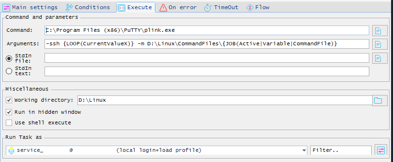 I've attached a screenshot of the execute task. I'm looping over a list of servers in a Job Variable. The list of servers match the connection names in the Putty profile. The batch commands are stored in text file saved into another Job Variable so you can swap the batches of commands in one place. You need local login+load profile for the Putty profiles to be available to plink. Hopefully this helps.