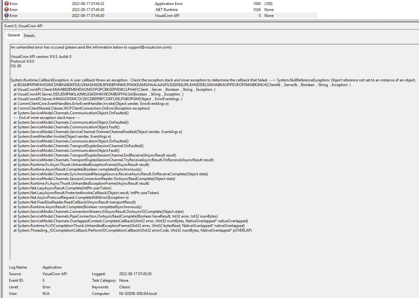 Our application stopped working today. It didn't crash, but all jobs failed with some very strange error messages (as in all kinds of weird symbols like #¤@ and so on). We restarted the service and it is working now.