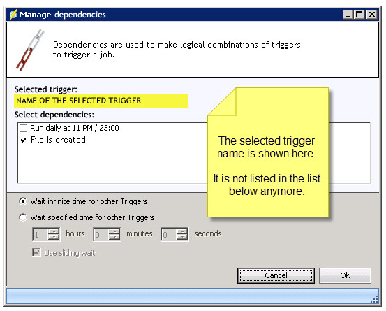 So in this example, Job B may start at 11:30 if Job A has already finished sucessfully. Or, Job A may be late, so if it finishes at say 11:50, then Job B runs immediatly afterwards (Trigger 2 - 11:30 has already fired, so is already flagged, Trigger 1 fired after Trigger 2).