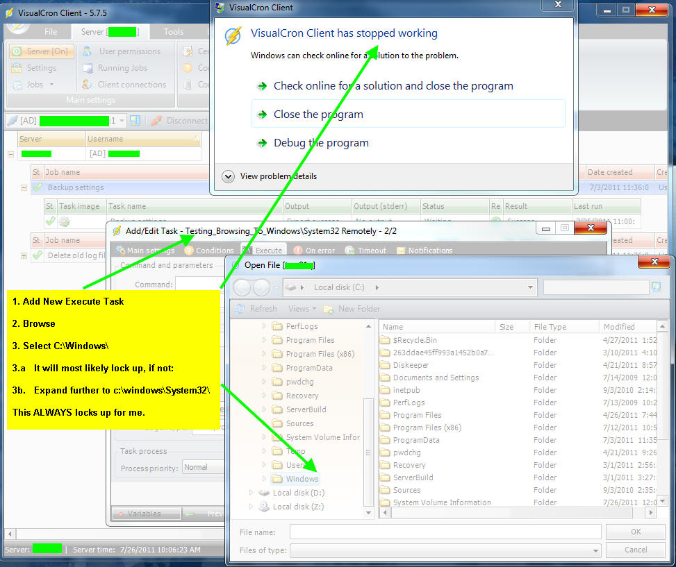 So, I open the client on my machine and go to add a new Execute task, though i don't think it matters what type of task. For the command, I click the browse button which brings up the REMOTE VC Server's list of drives. I expand drive C:, click on Windows. It 'sometimes' locks up when I click on windows. But if it doesn't, I can click the plus sign and expand Windows to then select System32 and this 100% of the time, locks up the client on my machine. I have to close it. The VC Server is not affected, I merely re-open my client on my own machine and can try again.