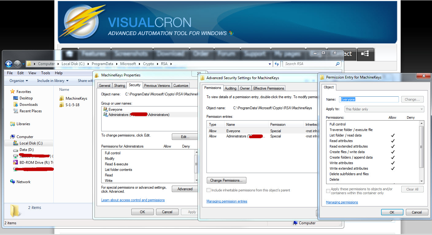Cconfigure the MachineKeys folder sercurities and give the user Read & Execute, List Folder Contents, Read, Write. If that doesn't work, try giving the Everyone user the same permissions. The user that needs access is the SYSTEM account unless you changed the user that runs the VisualCron service.
