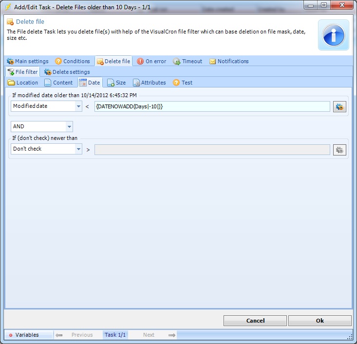 Has anyone used VisualCron to delete files based on 10 days prior to today's date? Also need to try to setup another job to delete all but the most recent 10 files, has anyone done this before with VisualCron? The files are located on UNC path (NAS device).