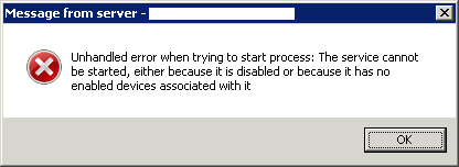 Error: "Unable to start process: The service cannot be started, either because it is disabled or because it has no enabled devices associated with it"