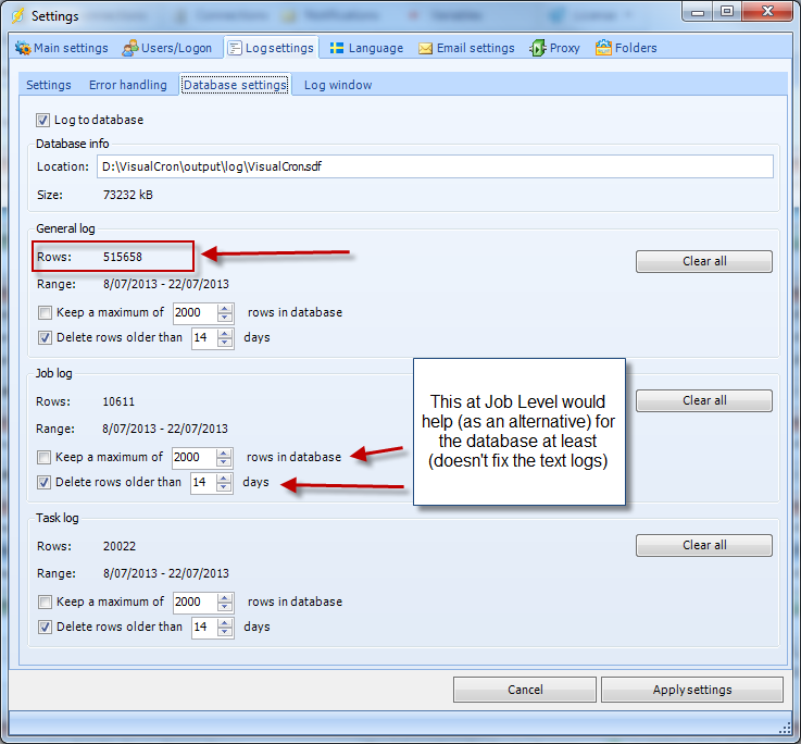 An alternative (for the database at least - doesn't help the text log files) would be to set a row limit as you do in the database settings (see screen print) which would allow us for example to set a row count to just keep ~ a day's history for the high frequency jobs.