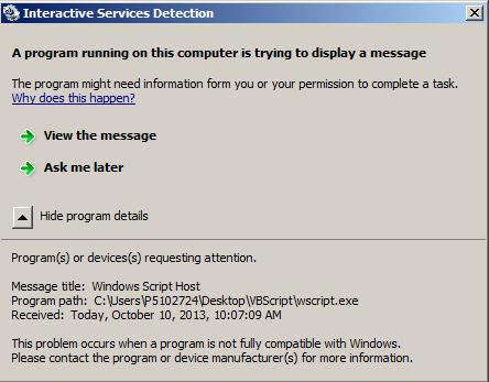 There really aren't many alternatives. You need to make you script silent as no new operative system likes running message boxes and visible applications in the background desktop as it is a security risk - hence the popup from the system.
