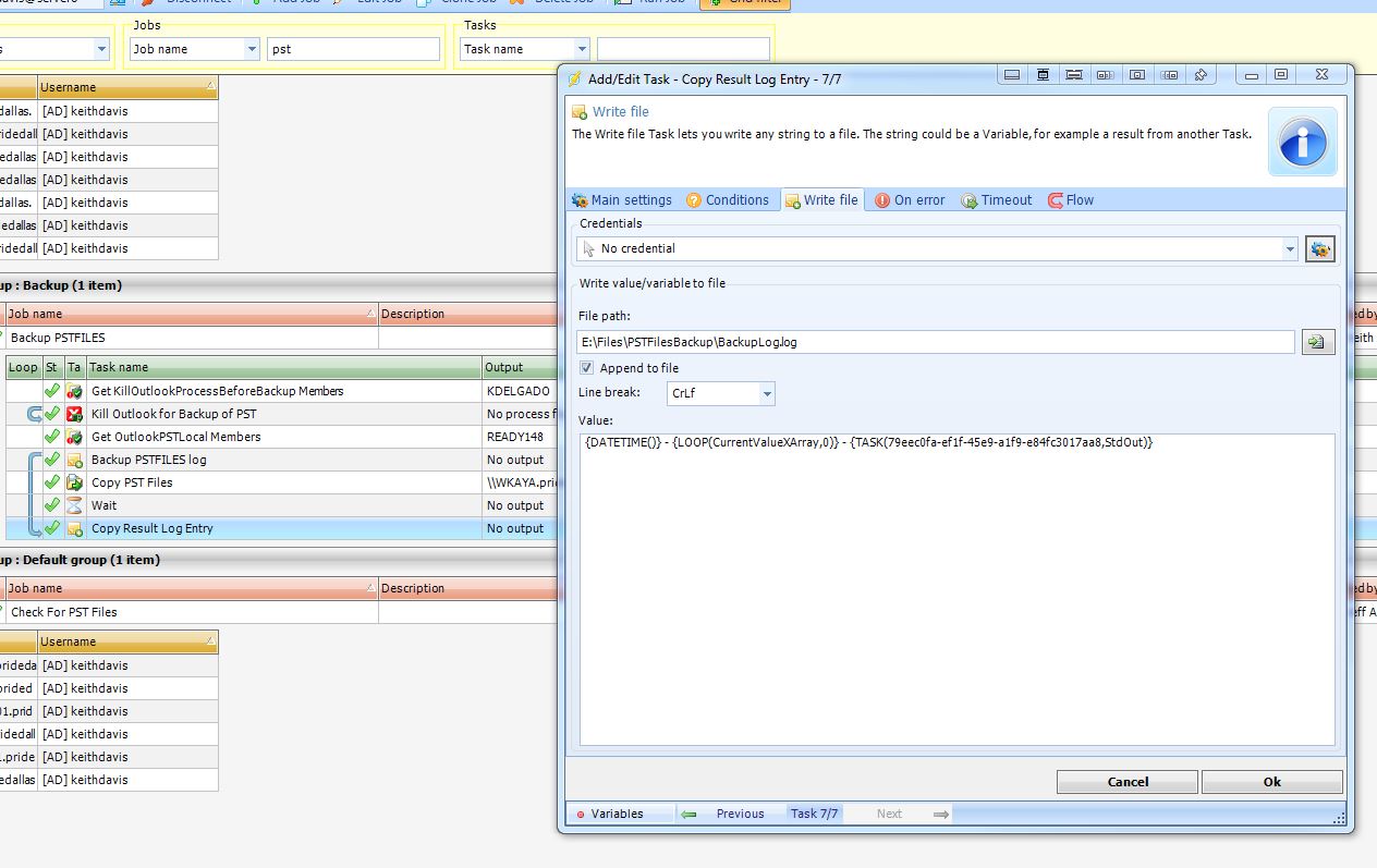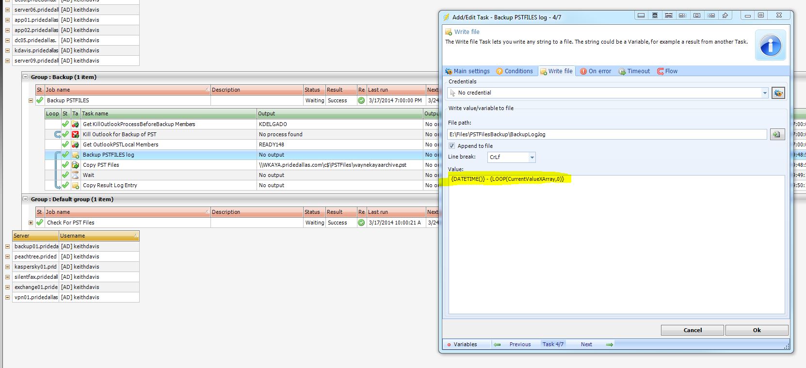 We have a job that creates a log by writing variables to a file. Sometime after 03/03/2014, that stopped working. Here is a sample showing when it began to fail: