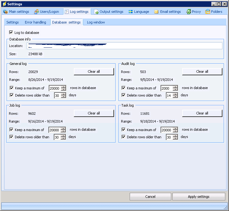 When it displays range for Tasks it states (09/18-09/19) Total rows 11681. Keep a maximum of 20000 is checked, and delete rows older than 30 days is checked as well.