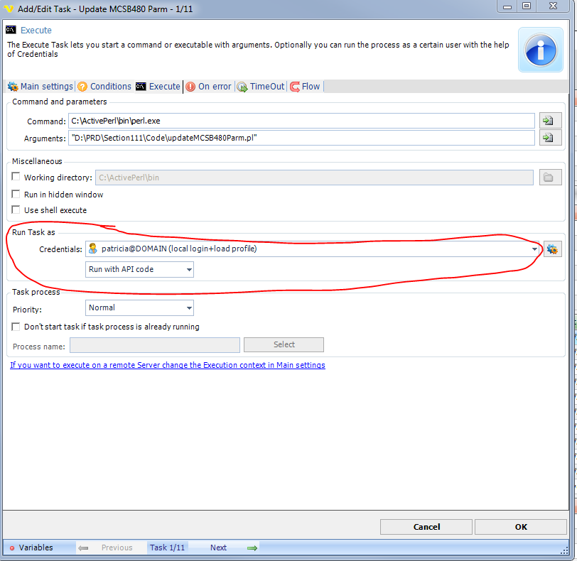 Notice that I use Credentials (patricia@DOMAIN(local login+load profile)). This is the only way I can get the perl script to run and write the output files to the defined path.
