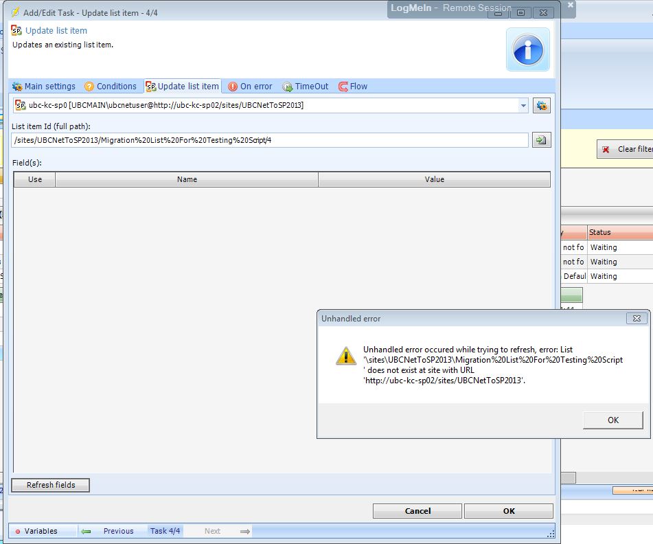 Regarding the SharePoint Update list item task configuration, I can select the List Item from the drop down menu, but the fields are not retrieved. When I click the "Refresh Fields" button, I get an error message, "Unhandled error occured while trying to the refresh, error: List '\sites\UBCNettoSP2013..." does not exist.
