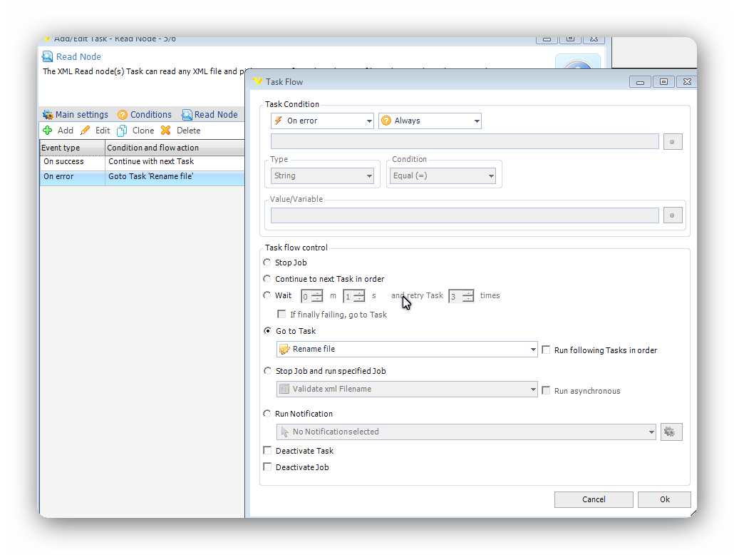 Screenshot 1 shows the Job structure. Screenshot 2 shows the FLOW for the READ NODE task. How can I only execute the 'Rename' task IF the READ NODE task fails?