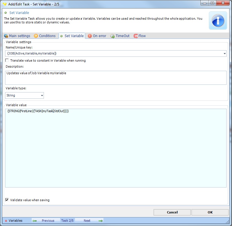 I have created a job variable and tried to manipulate the content of the variable in a popup task. I successfully managed to read the content of the variable in the task but could not figure out how to store the user input to that variable.