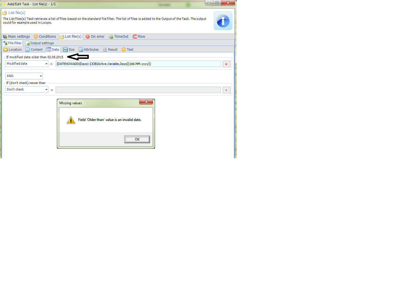 As you can see this fails when I insert the job variable as the number of days it should subtract. But as you can see where the arrow points, the correct date has been calculated. So clearly 'parts' of the program understand this field as proper date. If I substitute {JOB(Active,Variable,Days)} with say, the number 10, it works fine.