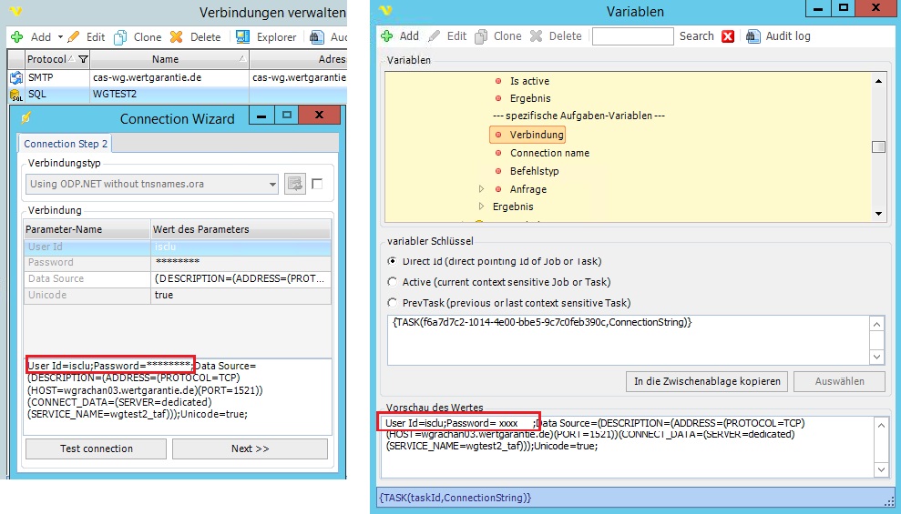In the setting for database connection he shows *******, but if you look at the variable "connection" for a SQL Task, then the password can be seen. (anonymous in the figure as xxxx).