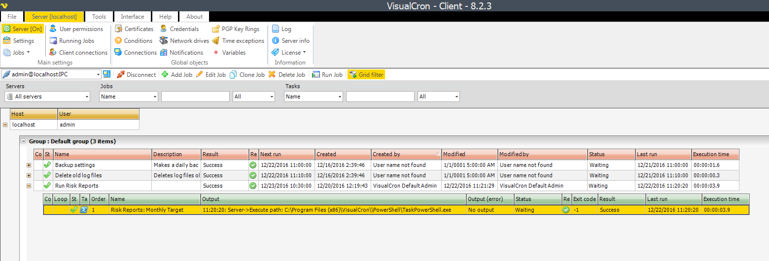 I'm trying to execute a powershell script through VisualCron and the task is set to execute Monday - Friday at 10:30am. The problem is that the powershell script is not executed. The script also does not execute if I try to run it manually in VisualCron, although the task shows as successfully run. Maybe this is a settings issue? I attached a few screenshots-