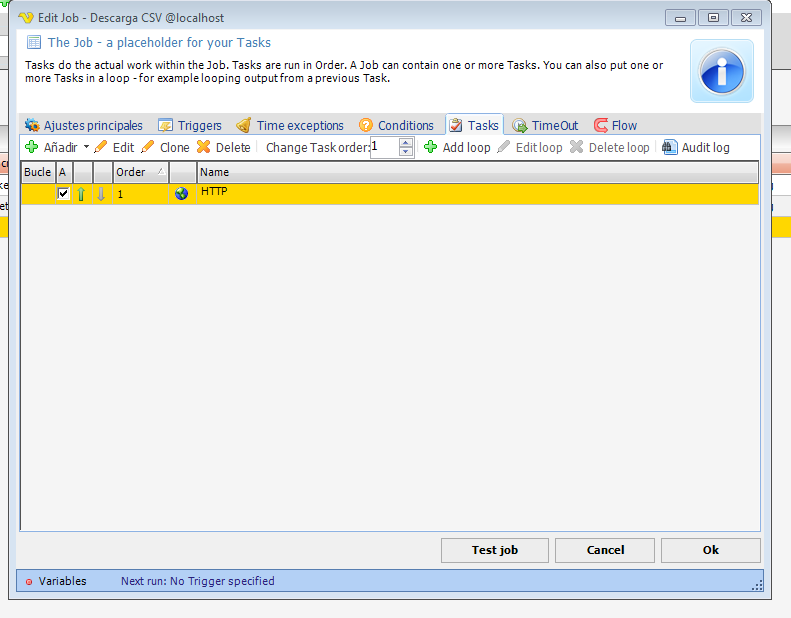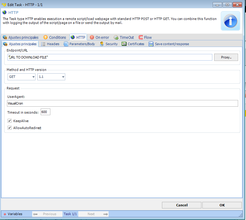 It´s an internal URL from my job. If I put the URL directly in the browser It works properly, downlods the CSV file, but If in VisualCron It doesn´t work. I don´t know what am I doing wrong