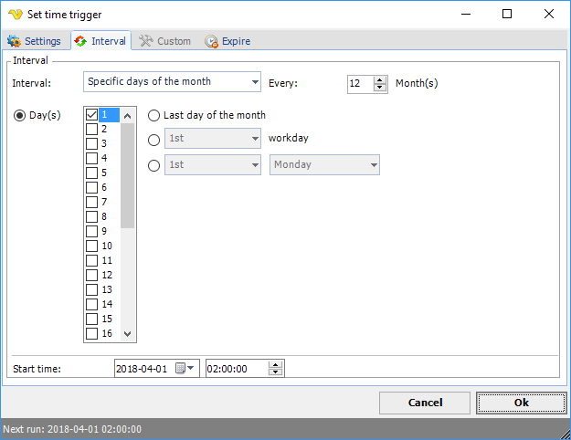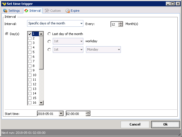 So if a want to use an Interval Time Trigger instead because it is much simpler/more intuitive I choose "Specific days of the month", Every 12 Month(s) and a day. I pick the Start time as the next particular date and a time. In my example 2019-01-01 at some time.