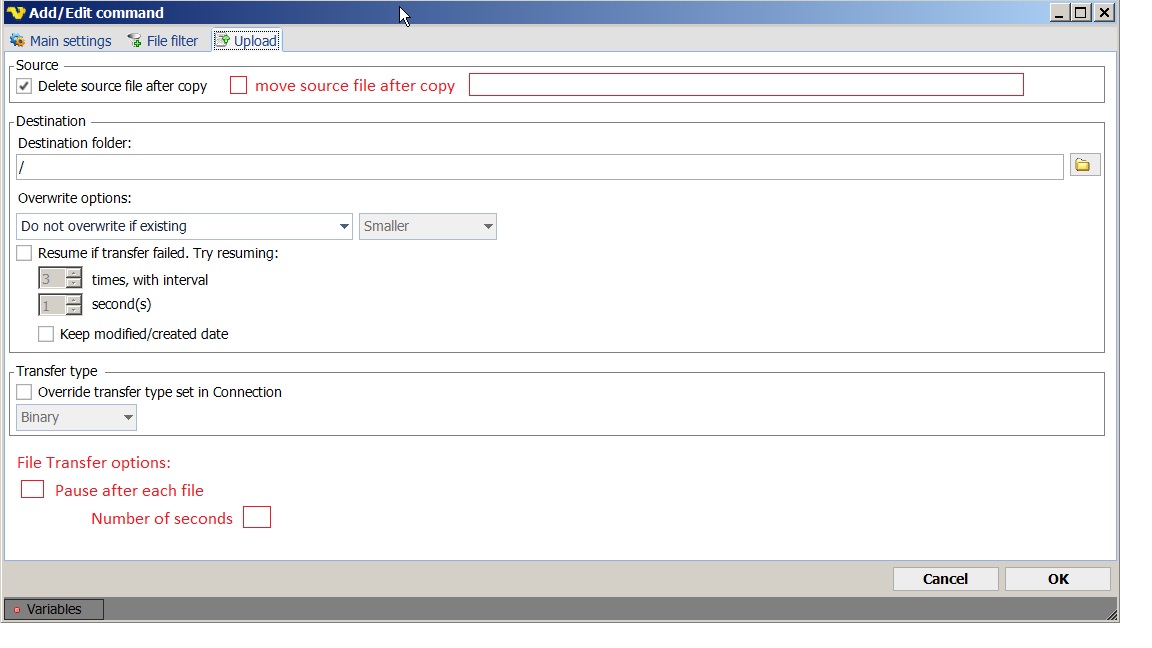 Request for additional options in the UPLOAD function for a FTP/FTPS/SFTP/SCP task.