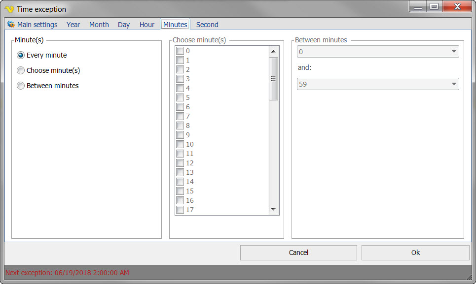 3. 5am to 5:44am: Under the Hour tab, I have "choose hours" selected, and I have 5am checked (all others are unchecked). Under the Minutes tab, I have "between minutes" selected, and my minute range is 0 to 44.