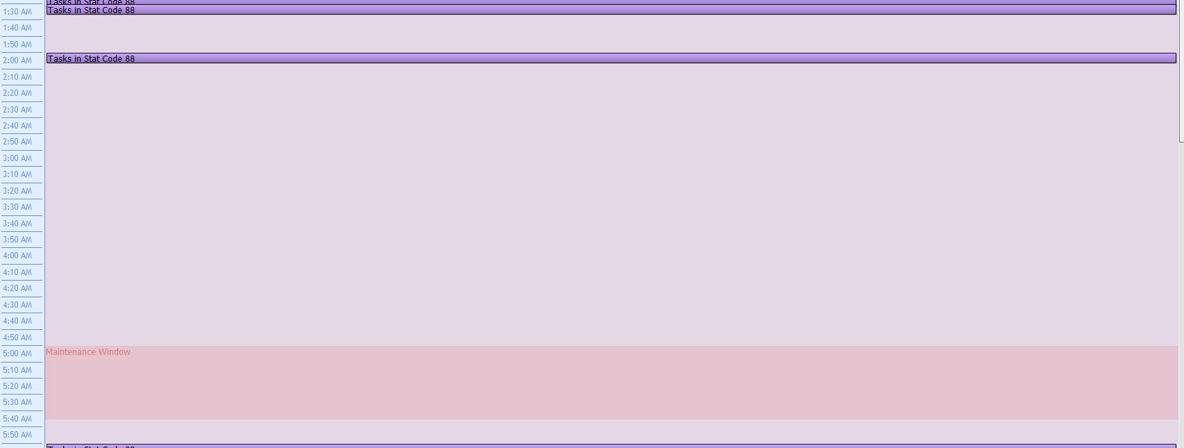 Based on the calendar, I see a number of issues. I don't know whether they're due to a bug, or due to my own misconfiguration. First, I've told it not to run on hour 1am, between minutes 30 and 59. To me, that means that it shouldn't run between 1:30am and 1:59am, so why does it want to run the job at 1:30am? Second, I have exactly the same situation with my 2am to 5am time slot. The third one is slightly different - I've told it not to run on hour 5am between minutes 0 and 44, so that should mean that it won't run between 5am and 5:44am. It looks like it realized that, but went beyond - it didn't restart the task until 6am, even though it's supposed to restart it at 5:45am.