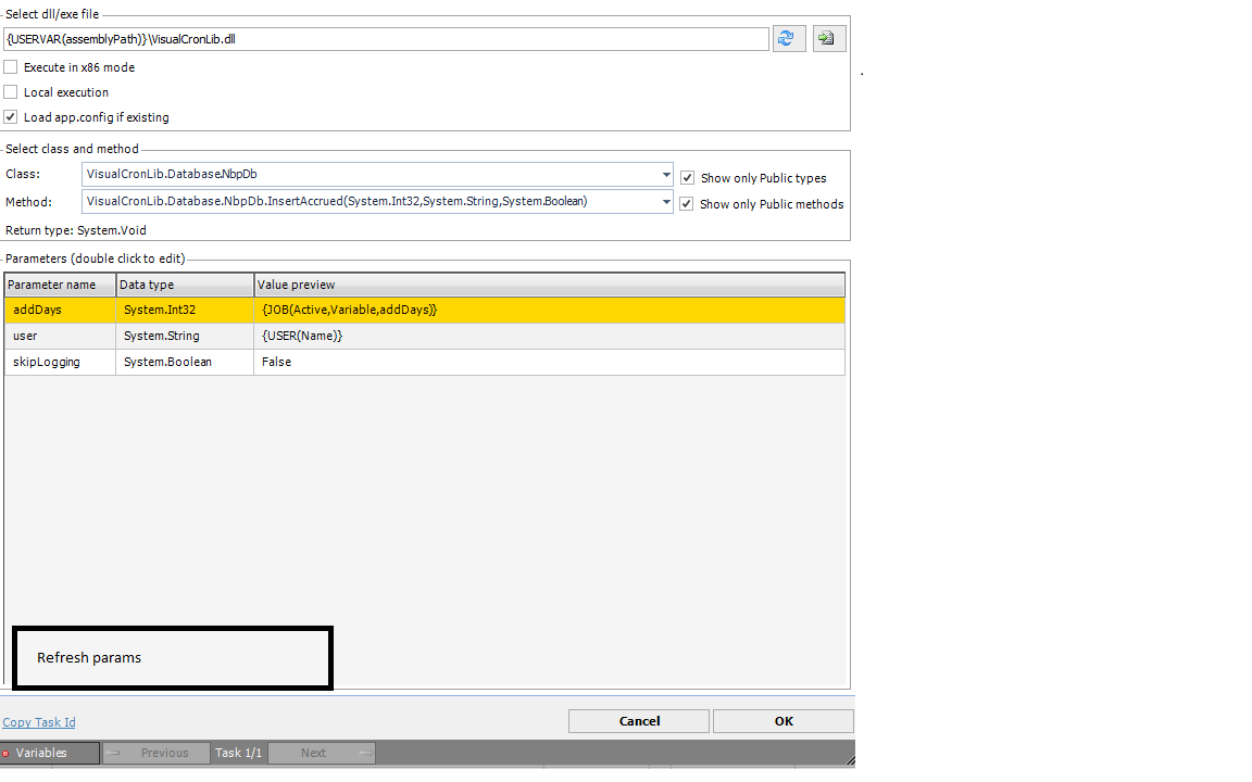 2)The .Net assembly task does not have a refresh parameters button. I would like to have one, with the same functionality as above.