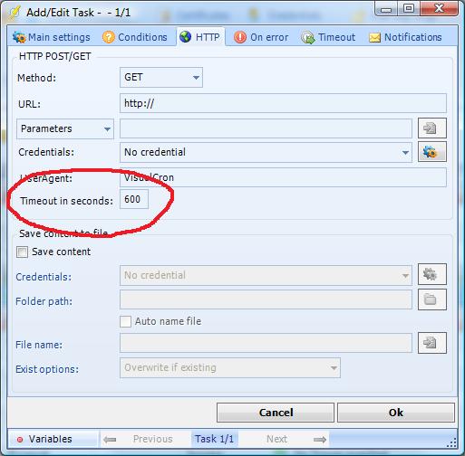 The HTTP request gets an error because the HTTP request is timing out when the request is made. It takes about 3-4 minutes to complete the HTTP request before a response is given and this seems to make VisualCron think the HTTP request has timed out.