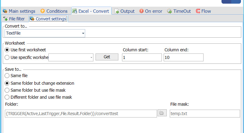 We use VisualCron 8.3.1 and have a task 'Convert to XLS', which is responsible for converting *.xlsx files to flat file (Text).