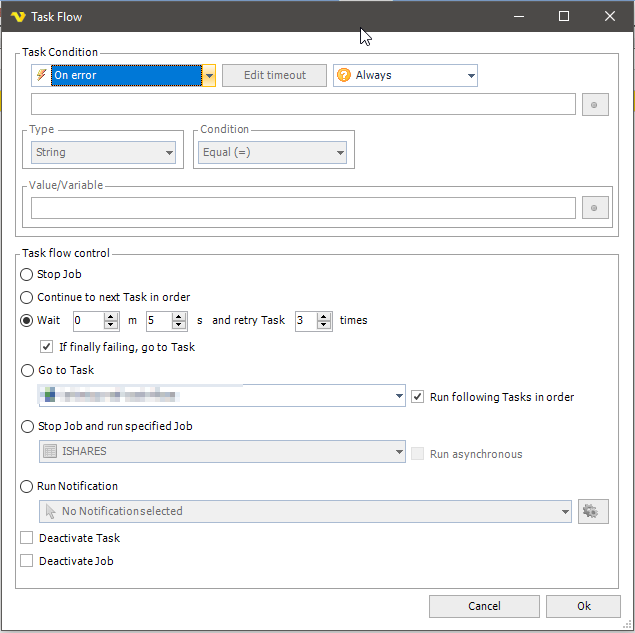 We have a few jobs that are not uncommon to fail – we have an “on error” flow to repeat per screen shot below. We also have a separate task to send an email notification on error – what we really need is the email notification to go out if after “X” tries it doesn’t succeed then go to next task in order.