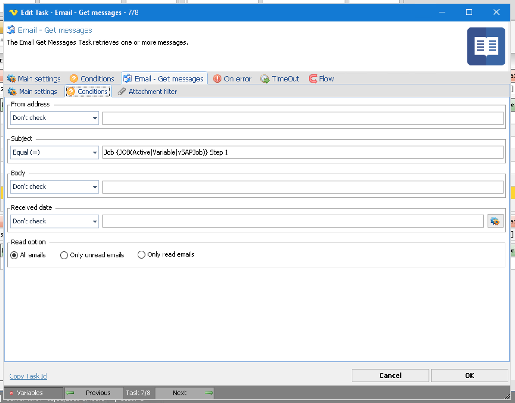 When we try to use variables in Conditions, the step doesn't run correctly, it doesn't find anything.