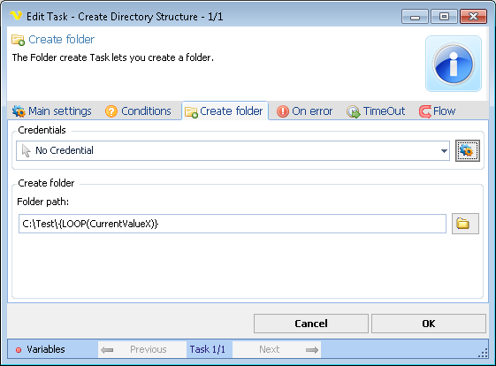 • In the "Create Folder" task I'm using path\{LOOP(CurrentValueX)}