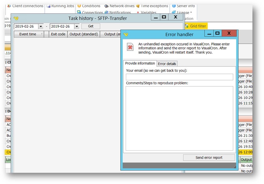 3) The VC client is trying to draw the 'Task history' window for 60+ seconds, however it is not successfully and then it throw 'Error handler' with the info that 'Unhandled Exception occured'.