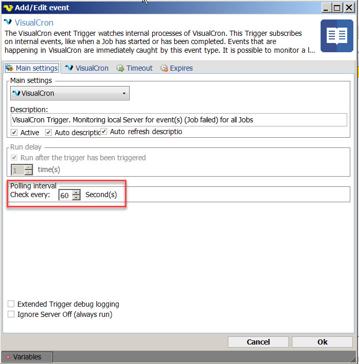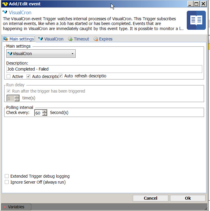 1. Job #1 - checks for jobs which have been inactivated, activated or deleted. If any of one these 3 things happen, an email is sent and a file is written to a network share. The trigger used is "Event - VisualCron", job Job-inactivated, Job-activated, Job-deleted). Polling for the trigger is set at 900 seconds