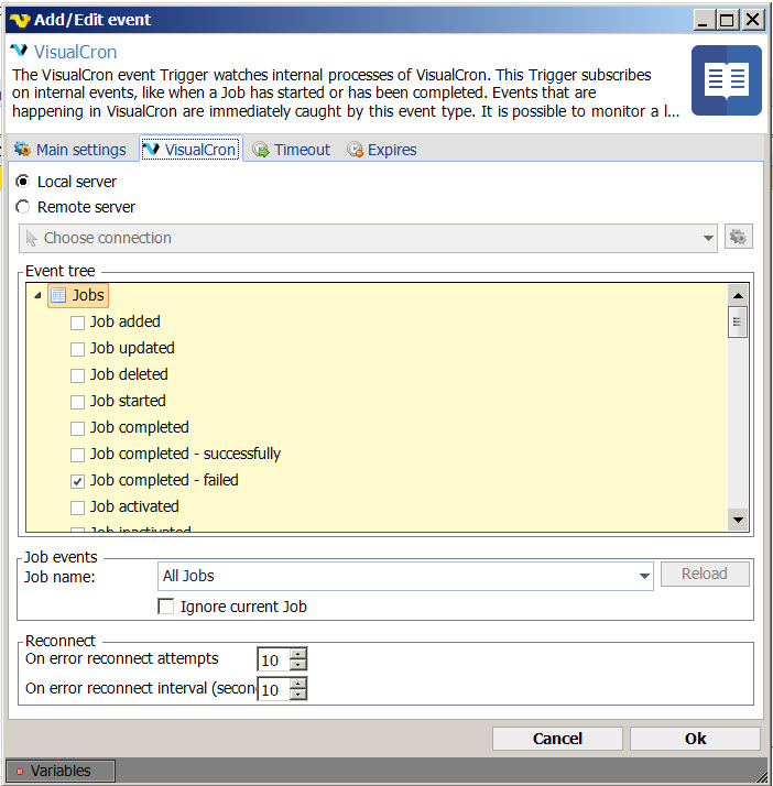 2. Job #2 - checks for a job which has a failed task but completes. If this occurs an email is sent and a file is written to a network share. The trigger used for this job is "Event - VisualCron, Job completed -failed, ". Polling for the trigger is set for 60 seconds