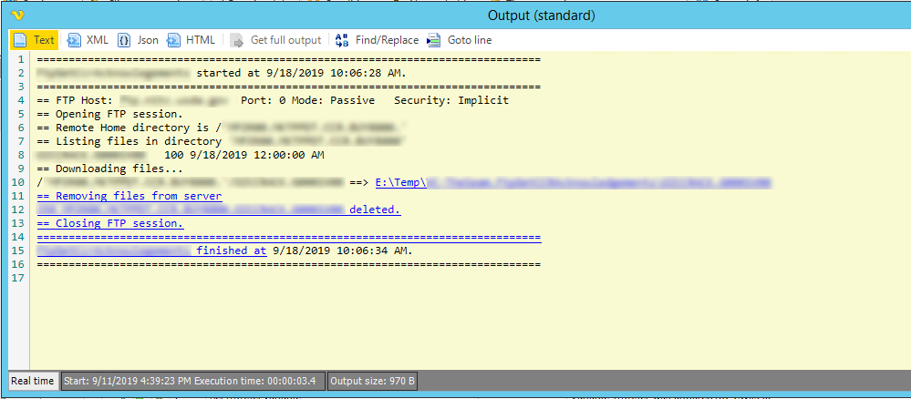 When the task output includes a file or folder path, VC auto-creates a link from it that you can click on to go to that file or location. This is great, but sometimes the link will extend over several lines and become useless. Case in point is the output I have from a PowerShell script I wrote which downloads files from an FTP server. As you can see in the screenshot, the link that starts with the location of a downloaded file runs on over several lines of text and is unusable.