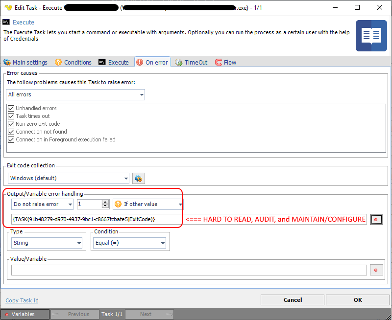 The alternative, {Task|TaskGuidGoesHere|ExitCode} is bad because: