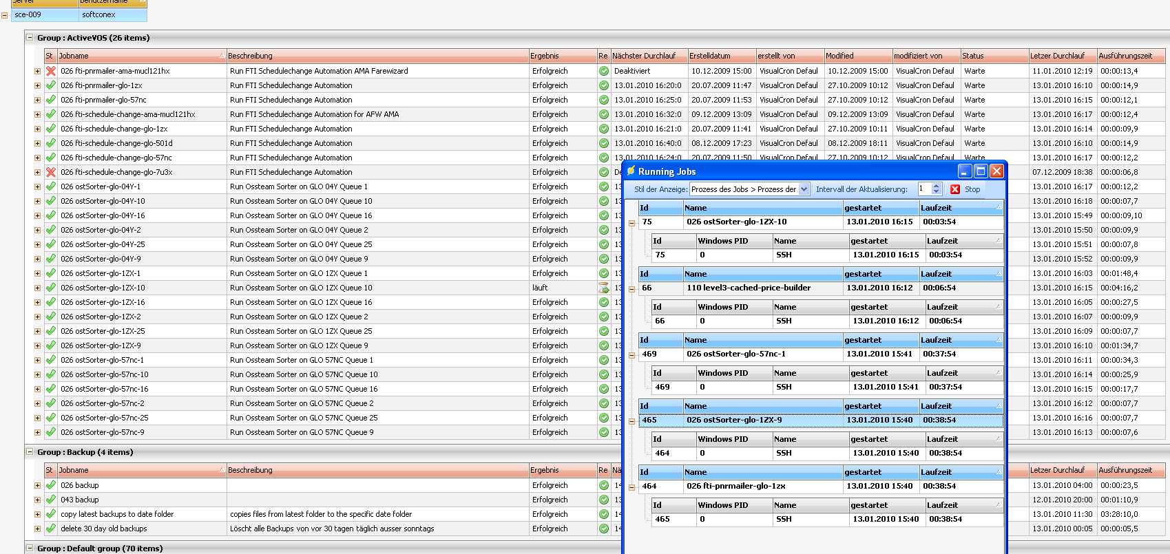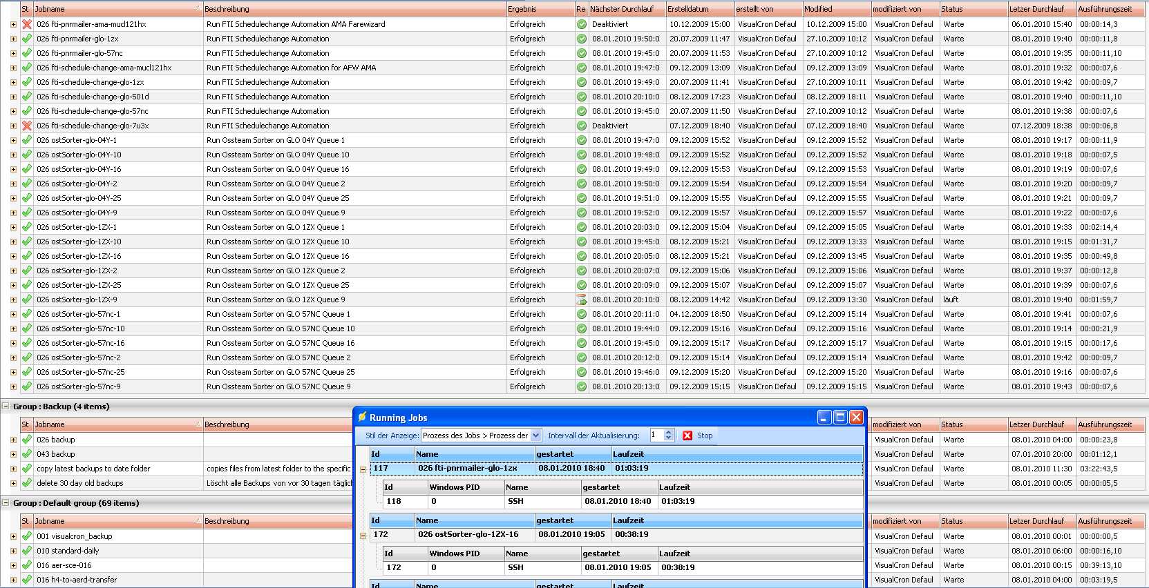 Additionally we noticed that the "running jobs" display shows ssh tasks running that have definately finished hours ago. Looking at the Visualcron client list of tasks these same tasks are displayed as successfully finished. Even after a server restart these tasks still show up as running in the "running jobs" display.