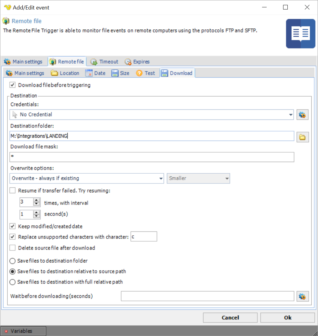When "Save files to destination folder" and "Save files to destination relative to source path" is selected, the files from all the folders are downloaded to the location specified all together without subfolders.