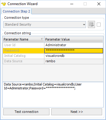 The Connection guide lets you select database and VisualCron will list common connection strings. Once you find a proper Connection string you can edit all connection string properties.